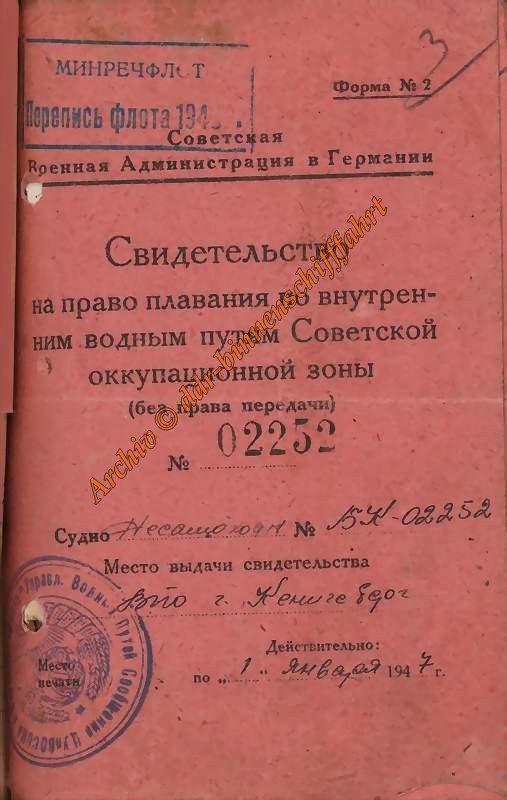 Nach der Beschlagnahme durch die sowjetische SMAD, wurden allen Schiffseinheiten zuerst eine meist 5-stellige Schiffs-Identziffer zugeteilt ( analog wie bei der grünen Flotte der GDS ) - darüber war es möglich jedes Schiff zu identifizieren.