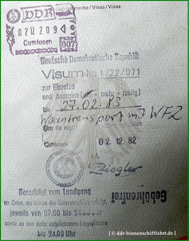 Ein Binnenschiff ist kein " Rennauto " - damit ist gemeint, das man bestimmte Strecken (insbesondere im Transitverkehr) nicht in einem Tag schaffen kann. Somit wurde für die Schiffsbesatzung ein Visum erteilt, welches Ihnen gestattete, an den dafür speziell eingerichteten "Feierabendstellen" (da durften nur Westschiffe liegen) in einem bestimmten Zeitraum (meist 1/4 Jahr gültig) an zu Land gehen.