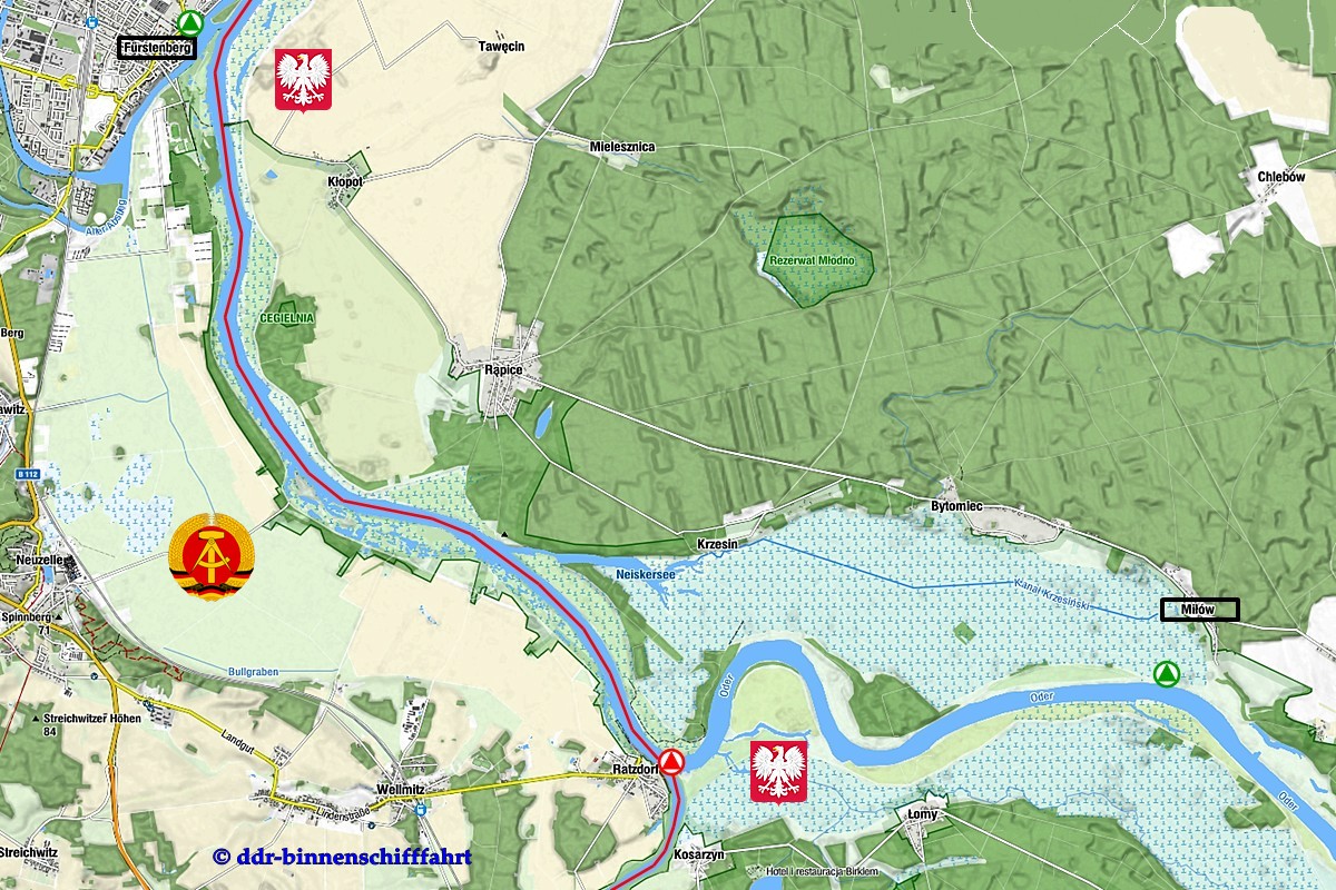 Dort befindet sich eine Dalbenreihe - sowie zwei kleinere Grenz- und Abfertigungsgebäude, in dem sich auch bis zur Einstellung des Personen- Ausflugsverkehr in Eisenhüttenstadt ein Abfertigungsraum befand. Ebenfalls abgefertigt werden konnte hier die private Sportbootschiffahrt, welche aber nur einen verschwindend kleinen Anteil ausmachte, da kaum einer der Reisenden Interesse an einer Fahrt ins südliche Polen zeigte.